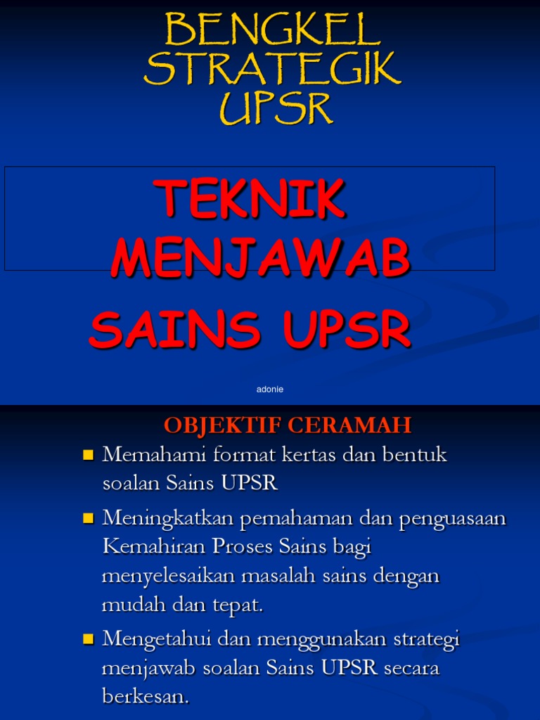Dengan menguasai subjek sains, negara malaysia barulah dapat berjaya dan mempunyai teknologi yang canggih pada masa depan. Peperiksaan upsr bagi kertas sains 018/1 dan 018/2 semakin hampir. Pada tahun 1995, format matematik diubah dengan memperkenalkan soalan subjektif. Debaran menunggu tarikh peperiksaan kertas sains semakin kemuncak iaitu pada 11 september nanti. Adakah anda calon upsr tahun 2018?