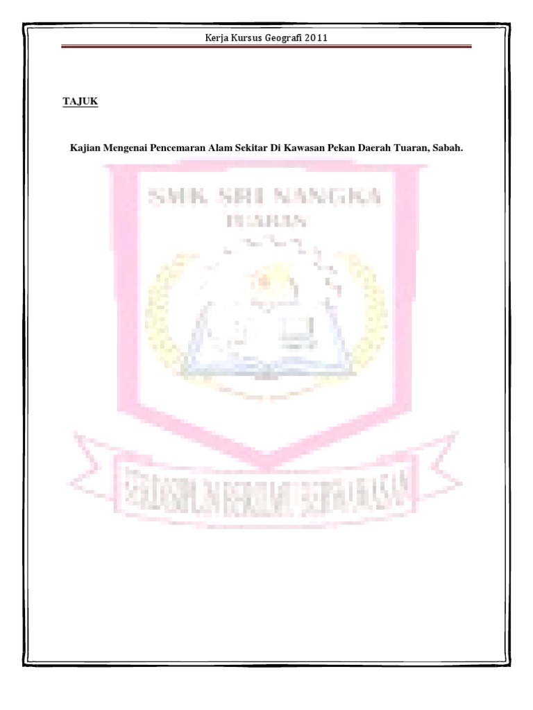 KERJA KURSUS geo - DOCX Document from cdn.vdokumen.net Kerja kursus syariah 930 4 set b by smk, taman forest. Contoh karangan ciri ciri pekerja cemerlang; Certificate of coursework moral example. Ta'zir by shahirah44 6132 views. Jutaan terima kasih saya tujukan buat ustaz subki selaku pensyarah tamadun islam yang telah banyak memberi tunjuk ajar dan. Contoh kerja kursus pbs stpm 2016 pengajian am 4 tajuk: English today online kursus bahasa inggris bisnis profesional. Kajian ini mengemukakan dua objektif iaitu mengenal pasti adat resam perkahwinan.
