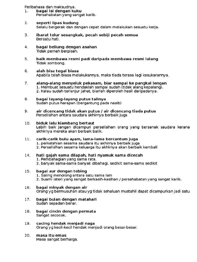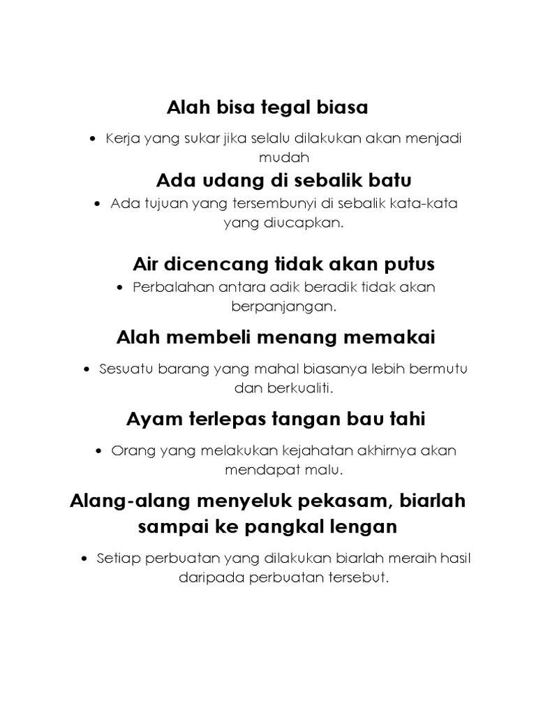 Berani kerana benar, takut kerana salah. Ada udang di sebalik batu. Bagai hujan jatuh je pasir. Posted by bahasaku indah at 10:53 ptg. 8) alah bisa, tegal biasa.