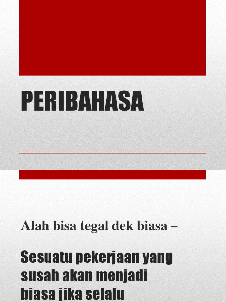 Dalam hal tata bahasa, negara barat memiliki proverb, jepang memiliki kotowaza, cina memiliki yanyu, sedangkan indonesia memiliki peribahasa. Tidak menepati janji dan menentang balik orang yang diberinya janji itu. Ikut hati mati, ikut rasa binasa. Alah bisa tegal biasa =sesuatu menjadi biasa, dan tidak terasa sukar lagi. Segala kesusahan tidak akan terasa lagi sesudah biasa. Kerja yang susah jika sering dilakukan akan menjadi mudah peribahasa bagai aur dengan tebing maksud : Bak kata perpatah, _ a alah bisa tegal biasa b hidup segan mati tak mahu c biar putih tulang, jangan putih mati d melentur buluh biarlah a ada rupa ada harga b alah bisa tegal biasa c ada pasang ada surut d ada udang di sebalik batu. Arti alah adalah kalah huruf depan peribahasa : Kerja memotong kayu itu alah bisa, tegal biasa sahaja bagi ah kow kerana sejak kecil lagi dia telah melakukannya. Sesuatu menjadi biasa dan tidak terasa sukar lagi. Memberikan perhatian yang istimewa terhadap sesuatu. Pada pendapat saya, video ini boleh menjelaskan peribahasa 'alah bisa, tegal biasa'. Bertindak kerana berada di pihak yang benar atau untuk menegakkan kebenaran.