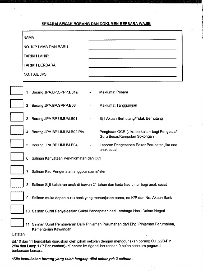 Maklumbalas siasatan polis bagi kes kemalangan jpa bp umum b03 18. Tuntutan pertukaran ke luar stesen rujukan dokumen : Senarai semak borang dan dokumen urusan persaraan kerana mencapai umur 55 tahun atau 56 tahun nama / no.kp : Perkara maklumat yang perlu disemak rujukan tuntutan pertukaran luar stesen 3.8 pegawai yang bersara 3.8.1 pegawai yang telah bersara juga layak untuk Senarai semakan dokumen bersara pilihan bil. Senarai semak persaraan wajib jpa. Persaraan kerana penswastaan agensi kerajaan di bawah seksyen 10 5 b 12 dan 12a 13 akta 227 239 rujuk pekeliling perkhidmatan bil. Semakan status permohonan permohonan ptb bagi bagi pekerja pihak pihak berkuasa berkanun dan tempatan. Permohonan penjaga jpa bp spt b02 17. Memo persaraan wajib dari seksyen sumber manusiamuat turun senarai semak dokumen persaraan. Permohonan persaraan pilihan yang telah disokong oleh ketua jabatan/ketua ptj hendaklah sampai ke pejabat pendaftar lapan (8) bulan sebelum tarikh persaraan. Abu bin rano sekolah : Suruhanjaya perkhidmatan awam other titles: